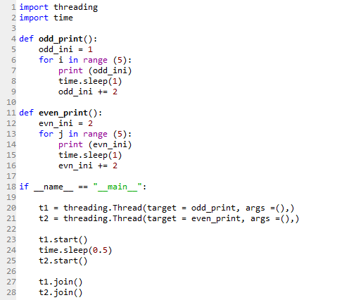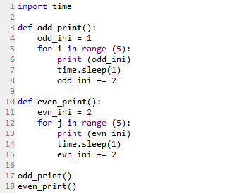 Suppose we have the following code consisting of two functions. Line 3 to 8 defines the odd_print function where it uses a for loop to iterate five times, by first printing the number ‘1’ (Line 6), pauses for one second (Line 7), and adds two to the previous number giving us the next odd number. Line 10 to 15 defines the even_print function, doing pretty much the same thing. What happens when the two functions are being called sequentially in Line 17 and 18?