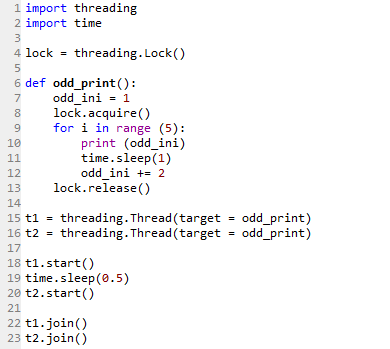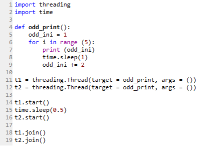 Two threads are then started by calling the same odd_print() function. Note that this time, the lines of code starting the threads (Line 11 to 19) are not nestled within the if __name__ == ‘__main__’: command. (See Threading blog post) The code would still run, just that it is not considered as a separate application.