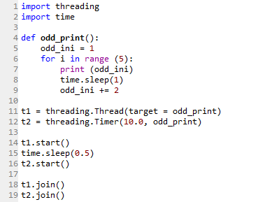Alternatively, a Timer function within the threading module could be utilised. In the code shown below, Line 12 utilises the Timer function to call the function odd_print after ten seconds as a second thread. Since the first thread takes about five second to complete printing the five odd numbers, there is ample time before the second thread is called after the first thread had completed printing the numbers, achieving the same printout result.