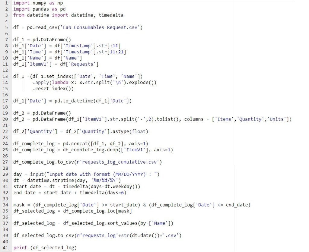 Line 5 read the Lab Consumables Request.csv file that was downloaded from Google Forms and placed in the same folder as this Python code.