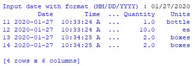 Line 34 then creates a Boolean mask using the specified date range, and Line 35 then filters out only the entries within this date range. Line 37 sorts this list according to the requestor’s name, just to make it easier to see all the items requested by the different lab users.