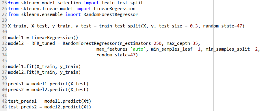 Line 31 creates a Linear Regression model, and Line 32 to 33 creates a Random Forest Regressor model (using tuned parameters from a previous post). This forms Level 0 of the stack.