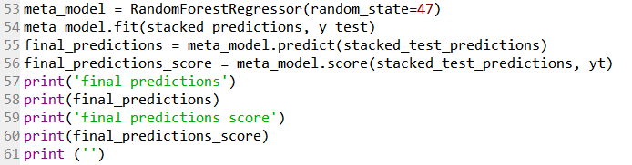 Line 53 creates a meta model (which forms Level 1 of the stack) using an Random Forest Regressor. Line 54 fits the predicted target variables of the validation set against its true values. In a way, this attempt to assess how much the prediction deviates from the true target variable. Line 55 then uses this deviation (i.e. error) to “compensate” for the prediction made for the test set. Line 56 then calculates the R-squared (R^2) value of this two level stacked model, which is 0.9101473807695799.