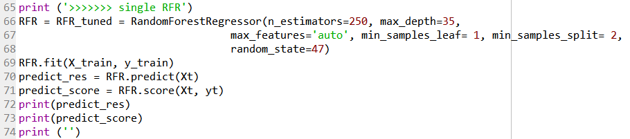Line 65 to 74 fits the Random Forest Regressor to the training data, followed by predicting the seven samples in the test data. The R^2 thus obtained is 0.9006710447409739.
