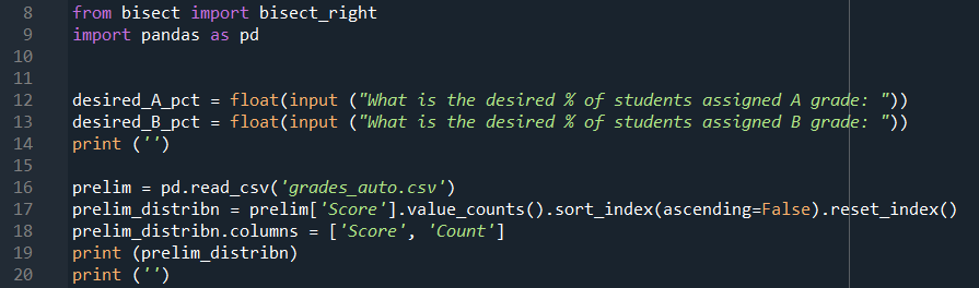 Line 12 and 13 asks the user to input the desired percentage of students to be assigned the A and B grade. Note that it is not necessary to ask for the inputs for the last grade category as the remainder would be assigned the last grade category.