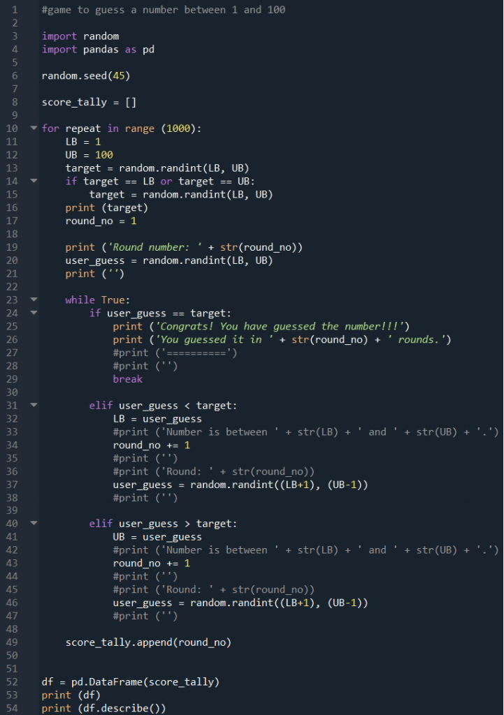 The following block of code then implements the binary search algorithm, where the guess will always be the middle value between the lower and upper bound values. A random seed value of 45 is also used.