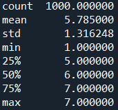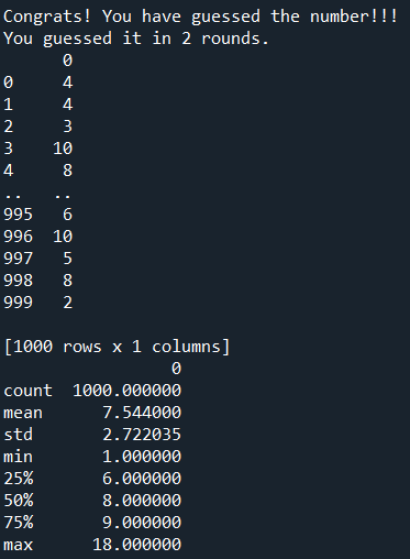 Some lines of the code have been commented out as we need not print the details of each round. Only the number of rounds of each game will be printed out on the IPython console. The list with the number of rounds taken for each game is then converted to a pandas dataframe, where the .describe() function is used to show the statistics of this set of game play.